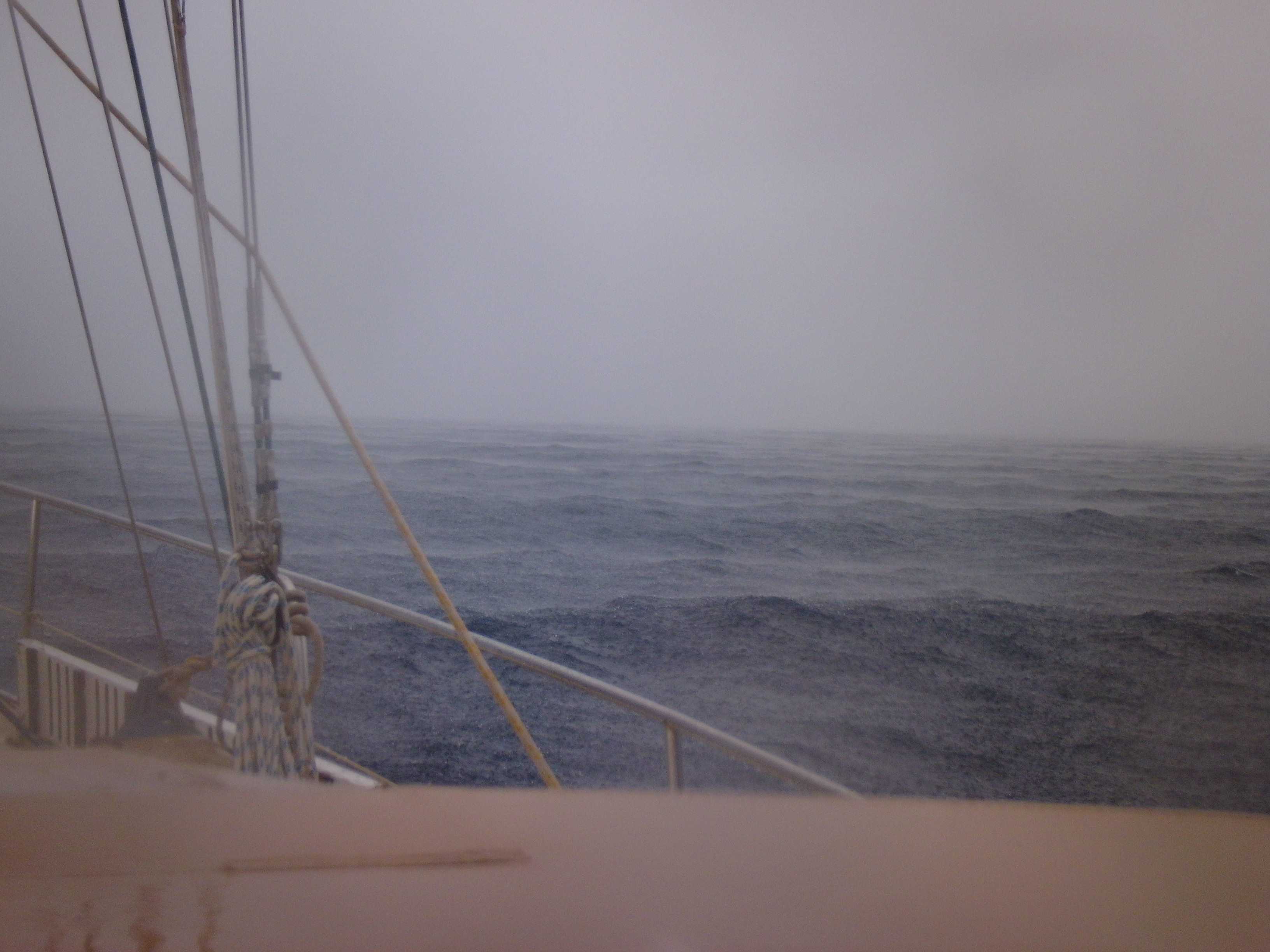 DSCI0092Da das Wetter sich morgens nicht entscheiden kann, ob es für oder gegen uns ist, gehen wir in die Offensive und laufen aus. Noch im Hafen rächt sich das Wetter und spielt sich auf: die dunklen Wolken werden noch dunkler, die Regentropfen fallen dichter und rund um uns zucken die Blitze. Ein paar Stunden später herrscht Weltuntergangsstimmung. Tropischer Regen bügelt die Wellen platt, die Sicht gegen gegen Null und wir fragen uns, ob man Metall anfassen darf, falls der Blitz in den Mast einschlägt. Bei den Argentiniern, die mit uns ausgelaufen sind, bricht ein Vorstag. Aber alles geht vorüber und am Horizont wird es auch schon wieder heller. Von Ankern und morgens ums Schiff schwimmen sind wir weit weg. Segeln zum Abgewöhnen?